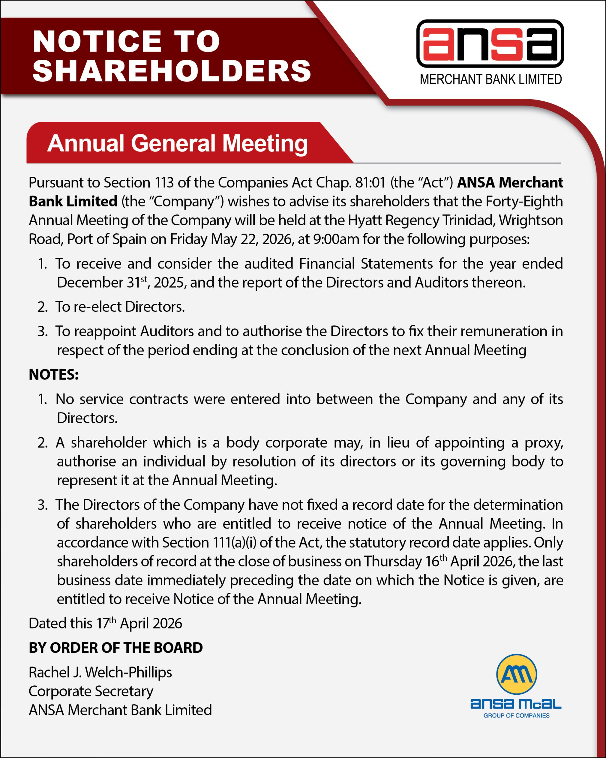 Notice of Annual Meeting of ANSA Merchant Bank Limited
